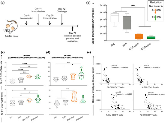 Furthermore, to characterize memory phenotypes of T cells, we investigated CM and EM cells in the splenocyte cultures using a multicolor panel. CM T cell phenotypes were characterized by CD127high CD44high CD45low CD62Lhigh CD197high and EM cells were characterized by CD62Llow CD44high CD127high CD197low. The results demonstrated that, after challenge, the percentage of CM CD4+ T-cells was higher in ChiA+SAP and ChiB+SAP groups when compared to control groups (Figure 5c). Regarding the subpopulation CD8+, it was observed that ChiA+SAP and ChiB+SAP enhanced the percentage of CM cells compared to SAL and ChiB+SAP, which also enhanced these cells when compared to SAP. Concerning EM cells, we found a high percentage of CD4+ T cells only in ChiB+SAP compared to SAL and SAP. On the other hand, for CD8+ T cells, only ChiA+SAP was able to generate these memory cells when compared to the control groups (Figure 5c). Moreover, we observed a negative correlation (Figure 5d) between the parasite burden and the percentage of CD4+ CM cells in the spleen (Pearson’s r = −0.4919; p-value <0.05). In addition, we found the same negative correlation for CD8+ CM cells (Pearson’s r = −0.4926, p-value <0.05), CD4+ EM cells (Pearson’s r = −0.5601, p-value <0.05), and CD8+ EM cells (Pearson’s r = −0.5333, p-value <0.05) (Figure 5e).