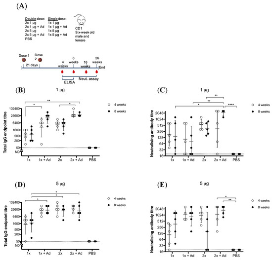 Vaccination of adult male and female CD1 mice with Binjari virus (BinJ)/West Nile virus (WNV)KUN-prME with and without AdvaxTM (Ad). Adult CD1 mice (n = 5) were immunized subcutaneously on the rump with purified BinJ/WNVKUN-prME in PBS. (A) Vaccination timeline. Geometric mean of total IgG antibody response and neutralizing antibody titers after vaccination with 1 μg (B,C) or 5 μg (D,E) purified BinJ/WNVKUN-prME. Antibody levels were measured by fixed-cell Enzyme-linked Immunosorbent Assay (ELISA) on WNVKUN-infected C6/36 cells using the 4G4 monoclonal antibody (B,D) and by micro-neutralization assay with wildtype virus strain WNVKUN on Vero cells (C,E). Error bars represent SD of the geometric mean. Limit of detection is represented by dotted line at 1/20 dilution. Multiple t-test statistical analysis was performed to determine statistical significance (* p < 0.0032, ** p < 0.0021, **** p < 0.0001).