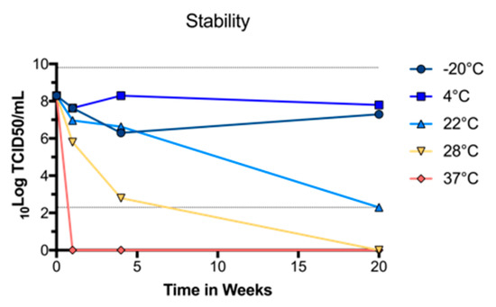 To determine whether purified BinJ/WNVKUN-prME was stable at different temperatures, we diluted the vaccine Preparation in PBS and incubated at −20 °C, 4 °C, room temperature (~22 °C), 28 °C or 37 °C, for either 1, 4 or 20 weeks. The vaccine was then titrated in a TCID50 assay, using C6/36 cells to determine the titer of infectious virus. We observed no drop in infectious virus titer up until four weeks when incubated at room temperature or lower (Figure 2). While the infectious virus titers dropped rapidly after incubation at 37 °C, or even at 28 °C, the virus was stable at 4 °C for up to 20 weeks, indicating that this vaccine can be effectively stored in a refrigerator.