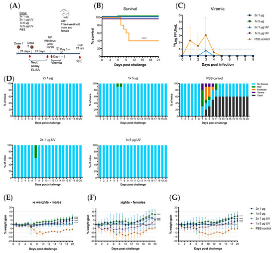 Virus challenge with WNVNY99 after vaccination with live of UV-C inactivated BinJ/WNVKUN-prME vaccine. Male and female adult CD1 mice were challenged intraperitoneally with 103 infectious units of WNVNY99 at 21 days-post vaccination (n = 10; five males and five females). (A) Timeline of vaccination and bleeding. (B) Survival shown for all mice for 21 days-post virus challenge. (C) Mean viremias were determined by IPA on C6/36 cells, fixed at 2 dpi and probed with hE16 anti-WNV E [26]. Limit of detection was 1 log10FFU/mL for individual serum samples. (D) Clinical signs of disease were collected for 21 days following infection by monitoring animals twice daily. Colors represent severity of clinical signs as a proportion of total animals in the group. Mouse weights were recorded daily and are represented as mean percentage of weight change from day of infection per group (G), or males (E) or females (F). Error bars represent SD of the mean.