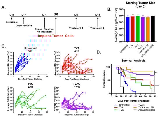 We reported earlier that synthetic peptides corresponding to the E6 and E7 oncoproteins of HPV-16 when admixed with α-GalCer adjuvant and delivered by the intranasal route reduced growth of the TC-1–Luc vaginal tumors and that co-administration of agonistic α4–1BB antibody was necessary to induce sustained tumor regression and a significant survival advantage []. Because α4–1BB immune checkpoint therapy (ICT) in the clinical setting was reported to be associated with significant toxicity [,,], we tested therapeutic vaccination in the absence of ICT by intranasal administration of the HPV peptides along with α-GalCer and CpG-ODN, two clinically relevant adjuvants with established safety profiles and proven potency to activate dendritic cells through divergent, but complementary, mechanisms [,,]. Groups of C57BL/6J female mice (n = 10) were hormonally synchronized as described in the methods section and implanted with 2 × 104 TC-1-Luc tumor cells followed by intranasal administration of the HPV peptide therapeutic vaccine containing α-GalCer and CpG-ODN together (TVAC), α-GalCer alone (TVA), CpG-ODN alone (TVC), or unvaccinated as per the scheme shown in Figure 1A. Prior to the initial vaccination, tumor bearing mice were size matched based on luciferase expression so that the average tumor sizes per group were between 7.36 × 102 and 8.32 × 103 (Figure 1B). Tumor growth was monitored using luciferase expression (Figure 1C) and survival was tracked for 90 days (Figure 1D). We observed sustained tumor regression in a high percentage (~85%) of mice receiving the TVAC (Figure 1C) that resulted in significantly extended survival compared to the untreated group (Figure 1D). Mice treated with TVA or TVC also showed significantly improved survival relative to the untreated control group, but far less percentage of mice exhibiting tumor regression, compared to that in TVAC. More importantly, the protective efficacy afforded by the TVAC in terms of survival advantage was comparable to that observed in mice treated with TVA in combination with α4–1BB antibody (Figure 1D). These results clearly support the efficacy of intranasal therapeutic vaccination, employing the combination of two potent and diverse acting adjuvants to treat established genital HPV tumors without the need for expensive and potentially toxic checkpoint immunotherapy.