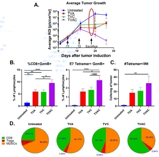 Tumor-bearing mice were sacrificed on day 18, one week after the second administration of different treatments and when the tumor growth became representative of the expected outcome (Figure 2A). Tumors were collected from each group of mice and analyzed for different immune cell subsets by flow cytometry. We observed significantly higher percentages of CD8 T cells expressing the cytotoxic molecule Granzyme B (GzmB) in mice treated with TVAC, relative to that of other groups of mice, and this was specifically exemplified in antigen-specific CD8 T cells, detected using an E7 peptide tetramer reagent (Figure 2B). The overall high density of E7 Tetramer + CD8 T cells per milligram of tumor in the TVAC group of mice suggests that generation of functional antigen-specific CD8 T cells and their trafficking to the tumor are major distinguishing correlates of protective immunity (Figure 2C). Furthermore, the greatly expanded percentage of functional CD8 T cells (60.8%) outnumber the total immune inhibitory populations of regulatory T cells (Tregs) and myeloid derived suppressor cells (MDSCs) together (39.2%) within the tumors from mice treated with TVAC relative to those in the other groups of mice (Figure 2D). Figure 2 shows compiled data from three separate experiments with minimum of eight replicates per treatment group.