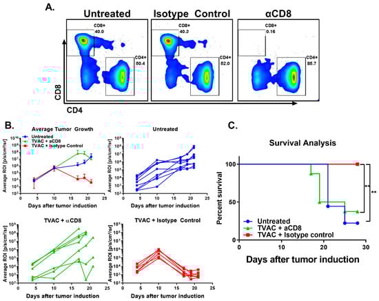 TVAC efficacy is dependent on CD8 T cells. Antibody for the depletion of CD8 T cells was administered by the intraperitoneal route every three days beginning one day prior to tumor induction as described in the methods. Depletion of CD8 T cells in the blood over time was ascertained via flow cytometry and representative flow plots are shown (A). Tumor growth and survival were recorded over time (B,C). Significance in survival proportions was measured using the log-rank test. p < 0.005 (**).