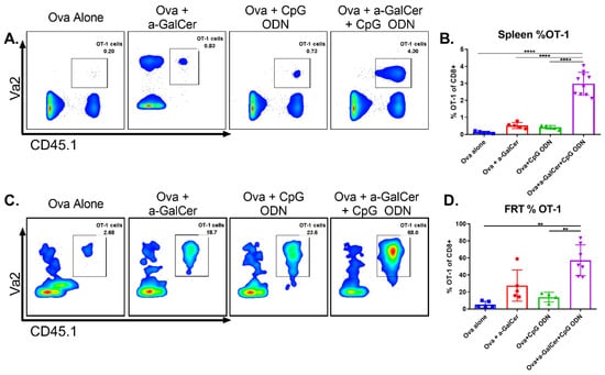 Intranasal vaccination using α-GalCer and CpG-ODN adjuvants affords significant increase of antigen-specific CD8 T cells to the female reproductive tract (FRT). Adoptively transferred OT-I cells were analyzed by flow cytometry in spleen and FRT one week after intranasal ovalbumin immunization using α-GalCer and CpG-ODN adjuvants individually or together. Representative dot plots for spleen (A) and FRT (C) along with cumulative data from multiple mice in two independent experiments are shown (B,D). Statistical significance was calculated using ordinary one-way ANOVA with multiple comparisons (B) and the Brown–Forsythe and Welch ANOVA with multiple comparisons (D), p < 0.005 (**), p < 0.00005 (****).