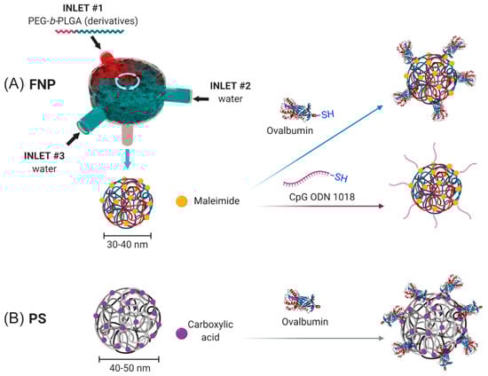 Nanoparticle conjugation schema. (A) Conjugation scheme for flash nanoprecipitation (FNP) produced PEG-b-PLGA NPs using maleimide-thiol chemistry for surface conjugation of thiolated ovalbumin (OVA) or CpG oligodeoxynucleotide (ODN) 1018. (B) Conjugation scheme for PS NPs using EDC NHS ester chemistry.