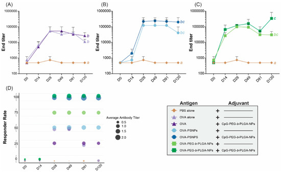 Antibody end titers over time. C57BL/6 mice were immunized twice, two weeks apart, intradermally at the base of the tail with the following formulations; PBS alone (Naïve), OVA alone, OVA + CpG-PEG-b-PLGA nanoparticles (NPs), OVA-PS NPs, OVA-PS NPs + CpG-PEG-b-PLGA NPs, OVA-PEG-b-PLGA NPs, or OVA-PEG-b-PLGA NPs + CpG-PEG-b-PLGA NPs. Treatments without a common letter were found to be statistically significant (α = 0.05) via a Kruskal–Wallis test with Mann–Whitney pairwise post-hoc comparisons. Comparison of (A) OVA alone with and without CpG-PEG-b-PLGA NPs, (B) OVA-PS NPs with and without CpG-PEG-b-PLGA NPs, and (C) OVA-PEG-b-PLGA NPs with or without CpG-PEG-b-PLGA NPs. All animals received 50 µg OVA. For CpG-PEG-b-PLGA NP groups, mice received 5 µg CpG. Graphs show average end titers for each group at each day (D) timepoint, D0, D14, D28, D49, D91, and D120. End titer was calculated as the closest to average of naïve mice + 3 SD, results shown as average ± SD for each time point (n = 4 mice per group). (D) Responder rate (%, n = 4 mice per group) and average antibody titer for each immunogen treatment as defined as OD420 above 1.0 at dilution 1500 (from Figure S2).
