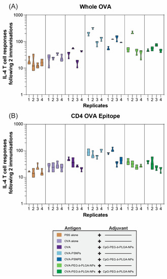 Interleukin 4 (IL-4) T-cell responses to nanovaccine formulations at day 28. C57BL/6 mice were immunized twice, two weeks apart, intradermally at the base of the tail with the following formulations; phosphate buffered saline (PBS) alone (Naïve), OVA alone, OVA + CpG-PEG-b-PLGA NPs, OVA-PS NPs, OVA-PS NPs + CpG-PEG-b-PLGA NPs, OVA-PEG-b-PLGA NPs, or OVA-PEG-b-PLGA NPs + CpG-PEG-b-PLGA NPs. All animals received 50 µg OVA. CpG-PEG-b-PLGA groups received 5 µg CpG. Graph shows IL-4 T-cell responses to (A) whole OVA and the (B) CD4+ T-helper OVA epitope by ELISpot assay. Individual mice (replicates 1–4 for control and treatment groups) are shown for each recall antigen ± experimental error from triplicate assay wells.