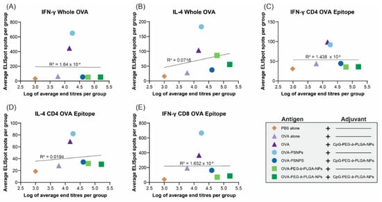 Correlations between cytokine levels and antibody end titers at day 28. C57BL/6 mice were immunized twice, two weeks apart, intradermally at the base of the tail with the following formulations; PBS alone (Naïve), OVA alone, OVA + CpG-PEG-b-PLGA NPs, OVA-PS NPs, OVA-PS NPs + CpG-PEG-b-PLGA NPs, OVA-PEG-b-PLGA NPs, or OVA-PEG-b-PLGA NPs + CpG-PEG-b-PLGA NPs. All animals received 50 µg OVA. CpG-PEG-b-PLGA NP groups received 5 µg CpG. Graphs show linear regression correlations between average antibody end titer (log) and the average number of IFN-γ and IL-4 producing cells from each group to (A,B) whole OVA, (C,D) CD4+ T-helper OVA epitope (ISQAVHAAHAEINEAGR), and (E) CD8+ cytotoxic T-cell OVA epitope (SIINFEKL).