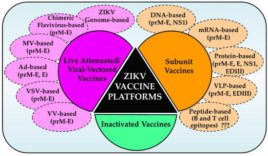 Schematic of various ZIKV vaccine platforms. Three major platforms: inactivated, subunit, and live attenuated/viral-vectored vaccines have been used to generate a number of vaccine candidates for preclinical and clinical testing. A variety of approaches and immunogens as shown were used. Immunoinformatics-based peptide vaccines have not been generated/tested (???). MV, measles virus; Ad, adenovirus; VSV, vesicular stomatitis virus; VV, vaccinia virus.