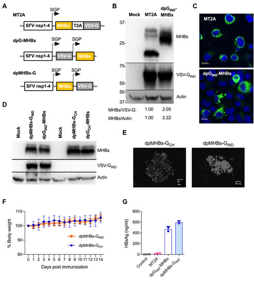 A previously described VLV vector, MT2A, uses a T2A peptide for MHBs expression in frame with VSV-G from a single subgenomic RNA but adds 18 amino acids to the MHBs C-terminus [8], which may cause aberrant processing and secretion of MHBs from infected cells. To determine whether expression of MHBs without any C-terminal modifications improves its production and secretion, we constructed a double subgenomic promoter VLV (VLV dp) vector dpGIND-MHBs expressing VSV-G of Indiana strain (IND) and MHBs under separate subgenomic promoters (Figure 1A). Since MHBs in this vector is at the 3’-end of the VLV RNA, we were concerned about the potential loss of MHBs during VLV replication. Therefore, we also designed an alternative vector with MHBs upstream of VSV-G, each expressed from separate subgenomic promoters (dpMHBs-GIND) (Figure 1A).