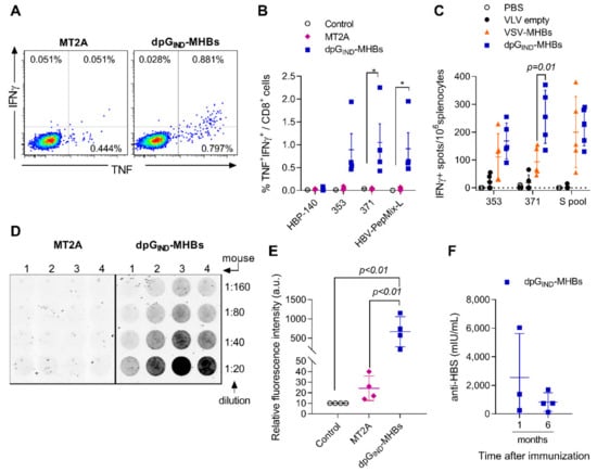 In previous studies, MT2A VLV immunization failed to induce anti-HBs antibodies [8]. To increase the sensitivity of anti-HBs detection, we customized an immunosorbent assay by using solid-phase absorbed HBsAg and fluorescent-conjugated anti-mouse secondary antibody. Serum samples collected at 4 weeks after immunization with MT2A showed a signal barely above background at 1:20 dilution (Figure 2D,E). However, serum samples from a dpGIND-MHBs-immunized group showed a detectable signal at dilutions of 1:20 to 1:160. Using a commercially available quantitative ELISA, we found that 3 out of 4 animals immunized with dpGIND-MHBs showed anti-HBs antibody levels above background (ranging from 243 to 6040 mIU/mL) at 1 month after immunization (Figure 2F). Six months after the single immunization, all the animals immunized with dpGIND-MHBs had anti-HBs antibody levels above background (ranging from 118 to 691 mIU/mL). Together, these data demonstrate that immunization with dpGIND-MHBs induced anti-HBs antibodies in naïve mice.