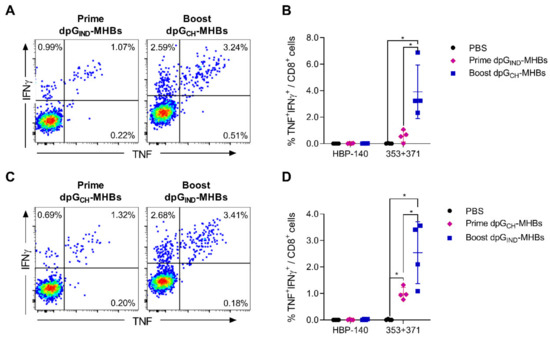 VLV dp homologous prime-boost immunization with glycoprotein switch enhances MHBs-specific splenic CD8+ T cell responses. C57BL/6 male mice were immunized with 1 × 108 PFU/mouse dpGIND-MHBs or dpGCH-MHBs. A subset of the mice (n = 4 in each group) was euthanized to measure effector responses at day 7 post-immunization (prime). The remaining mice (n = 4) were boosted with VLV having the opposite glycoprotein serotype at 4 weeks after the prime and euthanized 5 days later to measure the effect of the boost. Representative dot plots showing intracellular staining for TNF and IFN-γ in gated CD8+ T cells after re-stimulation with pooled 353 and 371 peptides are shown in (A) and (C). Frequency of the MHBs-specific CD8+ T cells (TNF+IFNγ+) is shown in (B) and (D). * p < 0.05, relative to PBS or prime groups, as indicated.
