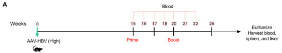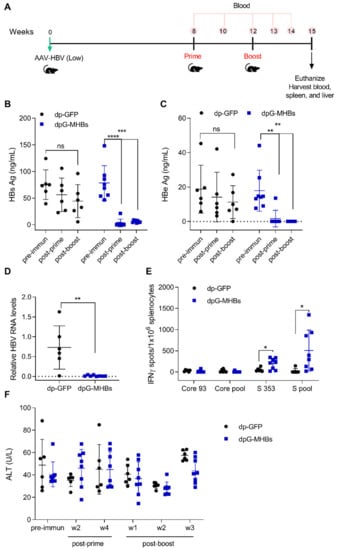 To establish lower levels of HBV replication, male C57BL/6 mice were transduced with 3 × 1010 genome copies of AAV-HBV 1.2-mer (SignaGen, Rockville, MD, USA). In those experiments where more elevated levels of HBV were desired, mice received 1 × 1011 genome copies of AAV-HBV 1.2-mer, and animals with intermediate (~500 ng/mL) or higher (~3000 ng/mL) levels of HBsAg were selected for the immunization groups. To assure stable antigen levels, persistent HBV replication was determined by measuring HBsAg levels in the serum at week 8 post-transduction. Animals were placed in experimental groups such that there were no statistically significant differences in antigen levels before immunization.