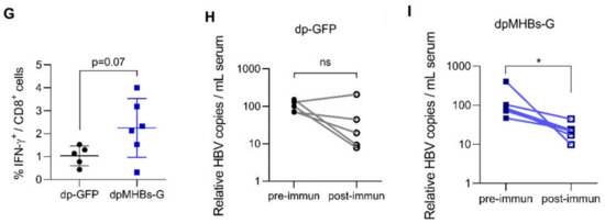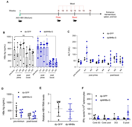 VLV dp prime-boost immunization significantly reduces HBV in mice with pre-existing intermediate HBV antigen levels. (A) Mice received 1 × 1011 genome copies of AAV-HBV followed by VLV prime-boost immunization. Analyses of T cell responses and antigenemia were then performed. (B) Serum HBsAg levels in the mice at the indicated time points pre- and post-immunization. (C) Serum ALT pre- and post-immunization. (D) Serum HBeAg levels in the mice pre- and post-immunization. (E) Liver RNA was quantified by RT-qPCR with GAPDH as the endogenous control 3 weeks after the final boost. (F) IFN-γ-producing cells in the spleen of immunized mice after stimulation with Core and S antigen peptides. (G) Percentage of IFN-γ-producing cells in the IHL of immunized mice after stimulation with S antigen peptides. (H,I) Serum HBV DNA pre- and post-immunization with (H) dp-GFP and (I) dpMHBs-G. * p < 0.05, ns = not significant compared to pre-immunization.