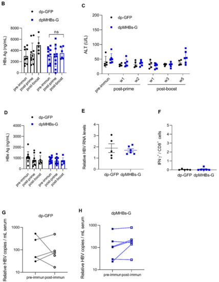 Prime-boost immunization in mice with intermediate HBV Ag levels had a moderate impact on HBV control. To further understand the effect of antigenemia on VLV dp-mediated HBV control, we evaluated anti-HBV efficacy in mice with even higher antigen levels. We transduced mice with AAV-HBV and screened for elevated HBs antigenemia (average HBsAg ~3000 ng/mL), followed by immunization with VLV dp as shown in Figure 6A. In contrast to mice with lower and intermediate Ag levels, mice that received VLV dpMHBs-G prime-boost did not show decreased serum HBsAg levels (Figure 6B). Furthermore, there were no changes in serum ALT (Figure 6C), HBeAg (Figure 6D), liver HBV RNA (Figure 6E), IHL IFN-γ production (Figure 6F), or serum HBV DNA (Figure 6G,H). Together, these data suggest that HBV Ag levels influence the ability of VLV dp prime-boost immunization to control HBV replication.