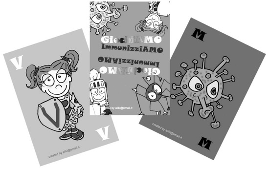 The winning playing cards depicted children with shields (suggesting the value of vaccination), while the loser cards had figures of microorganisms on them (Figure 1). These card games followed the rules of games belonging to the Italian tradition. For example, “Zompa Vaccino” which means “Jumping vaccine”, was based on the scheme of a popular card game, named “Salta cavallo” (Jumping horse).