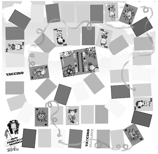 A board game called The Vaccine Goose was also used (Figure 2), revisiting the well-known Game of the goose. In this revised version, the winning boxes were represented by vaccinated individuals and allowed the gamer to reach the finish line earlier; conversely, cells with pathogen microorganisms, decelerated the path of the participant.