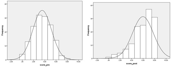 143 children filled the post-intervention questionnaire: 66 females (46.2%) and 77 males (53.8%). The mean knowledge score was 5.97 (SD = 1.81), with a distribution of scores with a marked left oriented tail (Figure 3).