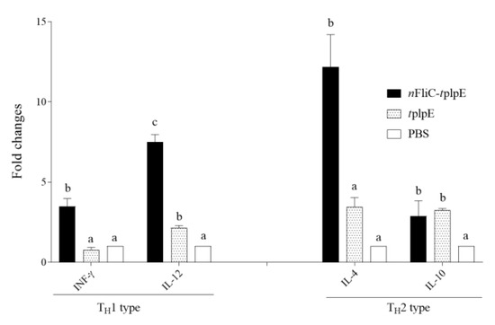 3.5. N-terminus of Flagellin Enhanced Gene Expressions of Both TH1 and TH2-Type Cytokines