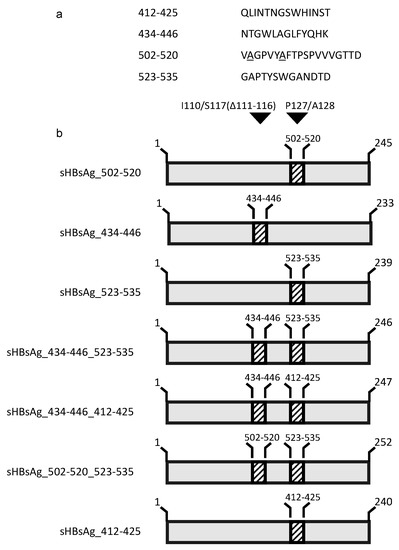 - Cheong, W.-S.; Drummer, H.E.; Netter, H.-J. Delivery of a foreign epitope by sharing amino acid residues with the carrier matrix. J. Virol. Methods 2009, 158, 35–40. [Google Scholar] [CrossRef] [PubMed]