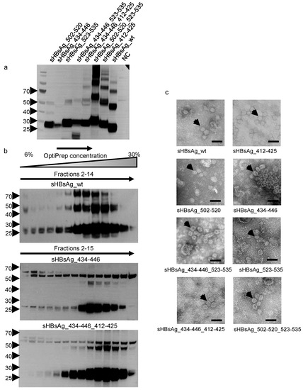 The chimeric VLPs were concentrated and partially purified from the cell lysate by ultracentrifugation on an OptiPrep gradient. Most of the sHBsAg protein monomer was distributed in fractions 9–13 (Figure 2b). The figure represents an example of the sHBsAg protein distribution in the OptiPrep gradient for sHBsAg_wt and two chimeric VLPs: sHBsAg_434–446 and sHBsAg_434–446_412–425. All other chimeric VLPs demonstrated analogous sHBsAg distribution profiles after gradient ultracentrifugation (Figure S1). Particle assembly was confirmed by transmission electron microscopy. The sHBsAg-positive fractions showed spherical particles approximately 20–30 nm in diameter (Figure 2c). In summary, although some differences in the particle expression level were observed, we were able to confirm sHBsAg-based chimeric protein production and particle formation for all designed VLPs.
