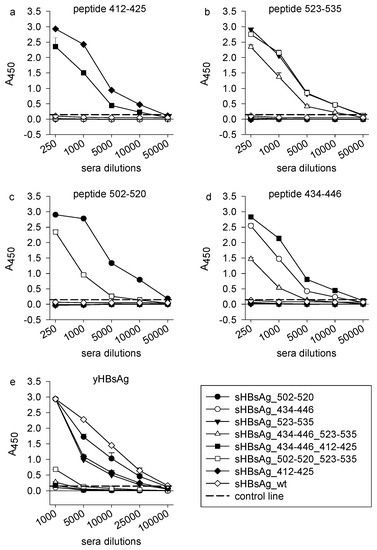 Immunization with chimeric sHBsAg-based particles elicited specific antibody responses in mice. (a–d) For analysis of binding of immune sera to HCV peptides, streptavidin-coated microplates were coated with 5 µg/mL of biotinylated synthetic peptides covering epitopes 412–425, 523–535, 502–520, and 434–446 of HCV E2. (e) For analysis of binding of immune sera to yeast-derived sHBsAg (yHBsAg), ELISA plates were coated with 5 µg/mL of purified sHBsAg protein derived from Pichia pastoris. The dilution factors of the mouse sera are shown on axis x. The mean A450 values are shown on axis y. The background signal from the negative control mouse sera was subtracted from the obtained results. The data represent the results from two independent experiments performed in duplicate, and error bars indicate standard deviations. The dashed horizontal line represents the cutoff value (three times the mean background value).