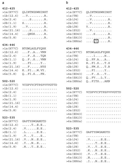 Amino acid alignment showing the sequence conservation of the regions 412–425, 434–446, 502–520, and 523–535 for full-length E1E2 (a) and HCVcc isolates (b) used in this study. The sequence derived from the HCV genotype 1a isolate H77C (GenBank accession number AF011751) is used as the reference and indicated on the top of each alignment. Other sequences are designated according to genotype (isolate). Amino acids conserved in reference to the H77C sequence are marked with dots. For 6a (HK6a), the boxed threonine is a cell culture adaptive substitution.