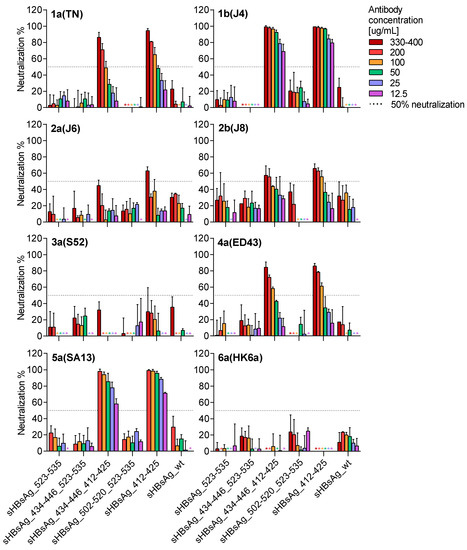 Finally, we evaluated the neutralizing potency of IgG purified from the mouse sera against genotypes 1–6 HCVcc. As shown in Figure 5, a neutralizing effect was only observed for antibodies derived from the mice immunized with VLPs carrying the 412–425 epitope (sHBsAg_412–425 and sHBsAg_434–446_412–425). These antibodies showed the most potent neutralization efficacy against genotype 1a, 1b, 4a, and 5a viruses, with 80–100% neutralization at the highest IgG concentrations. In addition, they were able to neutralize genotype 2a and 2b viruses with lower efficacy, approaching ~60% neutralization at the highest IgG concentrations. In contrast, for genotype 3a and 6a viruses, less than 50% neutralization was observed at the highest concentrations tested. For genotype 6a viruses, this is likely explained by the essential cell culture adaptive substitution N417T in the 412–425 region (Figure 4b) [43].
