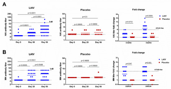 Hemagglutination inhibition and neutralizing antibody titers in subjects immunized with H7N9 LAIV or placebo. (A) HAI antibody titers. (B) MN antibody titers. Data were analyzed by Wilcoxon Matched Pairs Test (left and middle panels) and two-way ANOVA followed by a Bonferroni multiple comparison test (right panel).