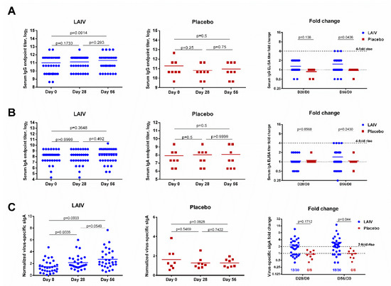 Concentrations of virus-specific sIgA significantly increased in immunized subjects after the first LAIV dose (p = 0.0035, Figure 3C). The second LAIV dose further boosted these antibody levels. Although the difference between antibody levels on days 28 and 56 was not statistically significant (p = 0.0549), the fold increase for LAIV recipients at day 56 was significantly higher than that for placebo recipients (p = 0.044, Figure 3C). Unlike serum antibody titers, which are determined using twofold serial dilutions (with seroconversion usually defined as a fourfold increase in titer), the virus-specific sIgA concentration is a continuous parameter. A twofold rise in the normalized virus-specific sIgA levels post-vaccination was therefore defined as a significant increase. Using this threshold, significant virus-specific sIgA antibody increases were observed in 13 (43.3%) vaccinated subjects after the first LAIV dose and 18 (60%) after the second dose (Figure 3C). As expected, no significant rise in sIgA was seen in the placebo recipients.
