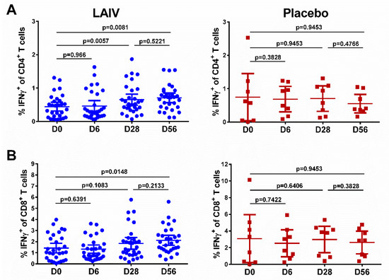Cell-mediated immune responses in subjects before and after administration of H7N9 LAIV or placebo (given on day 0 and day 28). (A) CD4+ T-cell responses. (B) CD8+ T-cell responses. Individual data are shown, along with means ± 95% CI. T cell levels at different time-points were compared using the Wilcoxon matched-pairs test. The exact two-sided p values are shown.