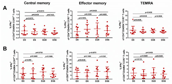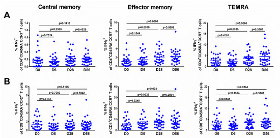 The levels of effector memory T cells, but not central memory T cells, increased after vaccination, and were significantly higher than the baseline after the first and the second dose, for both CD4+ and CD8+ subsets (Figure 5, middle panel), although no booster effect of the second LAIV dose was noted. Interestingly, significant levels of CD8+ virus-specific Tem cells had been induced by day 6 after the first LAIV dose (p = 0.0248, Figure 5B); this was the only T-cell subset that was significantly increased at this time. The frequency of IFNγ-secreting CD4+ TEMRA cells was also increased on day 28 after the first LAIV dose, whereas two doses were required to produce a significant increase of the CD8+ TEMRA cells. No significant increases in any of the T-cell subsets were seen in the placebo group (Figure 6).