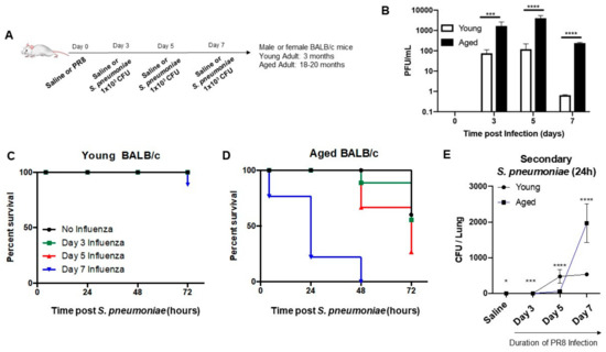 Impact of primary influenza infection on susceptibility of aged adult mice to S. pneumoniae. (A) Young (3 months) and aged adult (18–20 months) mice were intranasally instilled with PBS or influenza (A/Puerto Rico/8/1934, H1N1) prior to secondary intranasal instillation with S. pneumoniae (1 × 103 CFU) on day 3, 5, or 7 of influenza infection. (B) Viral titers were quantified in young and aged adult BAL samples collected at select time points post infection by serial dilution. (C,D) Survival was assessed in young and aged adults at 24–72 h post secondary S. pneumoniae instillation. Black line: PBS/no influenza, green line: S. pneumoniae administered at day 3 of influenza, red line: S. pneumoniae administered at day 5 of influenza, blue line: S. pneumoniae administered at day 7 of influenza. (E) Bacterial titers in BAL collected at 24 h post secondary S. pneumoniae infection were quantified in young and aged adult lung. Student’s t-test: * p < 0.05, *** p < 0.001, and **** p < 0.0001. Similar results were obtained from at least three independent experiments, with N = 5 per group. Data are expressed as the mean ± SD.