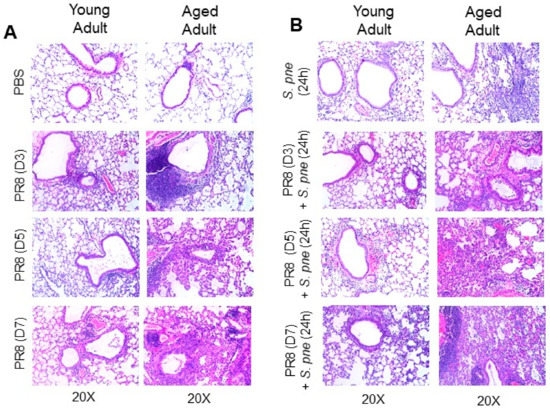 Influenza epidemics still remain a leading cause of morbidity and mortality worldwide, with the highest incidence of hospitalization and death occurring in persons >65 years of age. Age-associated alterations in immune surveillance—specifically, decreased innate and adaptive immune responses and dysfunctional immune regulation—can be responsible for increased lung pathology to infectious stimuli [1,2,3,4,5,6]. A primary influenza infection, through virally imprinting on immune responsiveness, can have a significant direct or indirect influence on secondary infections and vaccine efficacy [7,8]. Bacteria, especially Streptococcus pneumoniae, are the most common pathogens that commonly cause pneumonia in the elderly [2]. Upregulation of epithelial cell surface receptors in response to chronic inflammation can increase bacterial adhesion and accumulation in the aged lung and correlate with an age-associated increased in host susceptibility to pneumonia [2,9]. Depressed clearance mechanisms, such as cough, oral and mucociliary clearance, and swallowing disorders, can also increase susceptibility [10,11,12,13].