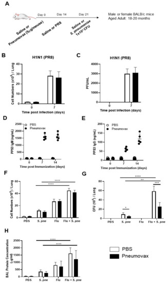 Impact of influenza on pneumococcal vaccine effectiveness during S. pneumoniae infection in aged lung. (A) Aged adult (18–20 months) mice received a subcutaneous injection of PBS or Pneumovax (5 mg/mouse) on day 0. On day 14 post vaccination, mice were intranasally instilled with PBS or influenza (A/Puerto Rico/8/1934, H1N1) prior to secondary intranasal instillation with S. pneumoniae (1 × 103 CFU) on day 7 post influenza. (B) Total cell counts and (C) viral titer were assessed in BAL collected from PBS- and Pneumovax-treated mice on day of influenza. (D) IgM and (E) IgG PPS3 antibody levels were assessed in serum collected on day 7 and 14 post vaccination. (F) Total cell counts, (G) bacterial titers, and (H) protein concentration in BAL collected at 24 h post-secondary S. pneumoniae infection were quantified in aged adult lung. Student’s t-test: * p < 0.05, ** p < 0.01, *** p < 0.001, and **** p < 0.0001. Similar results were obtained from at least three independent experiments, with N = 5 per group. Data are expressed as the mean ± SD.