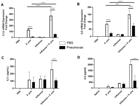 Influenza-mediated changes in IL-1β and IL-6 cytokine production in Pneumovax-vaccinated aged adult mice during S. pneumoniae infection. Aged adult (18–20 months) mice received a subcutaneous injection of PBS or Pneumovax (5 mg/mouse) on day 0. On day 14 post vaccination, mice were intranasally instilled with PBS or influenza (A/Puerto Rico/8/1934, H1N1) prior to secondary intranasal instillation with S. pneumoniae (1 × 103 CFU) on day 7 post influenza. (A) IL-1β and (B) IL-6 mRNA expression was assessed in lung tissue collected from unvaccinated and Pneumovax-treated mice at 24 h post S. pneumoniae. (C) IL-1β and (D) IL-6 cytokine production was quantified by ELISA using BAL collected from unvaccinated and Pneumovax-treated mice at 24 h post S. pneumoniae. Unvaccinated and Pneumovax mice receiving only PBS or influenza alone were used as controls. Student’s t-test: *** p < 0.001 and **** p < 0.0001. Similar results were obtained from at least three independent experiments, with N = 5 per group. Data are expressed as the mean ± SD.