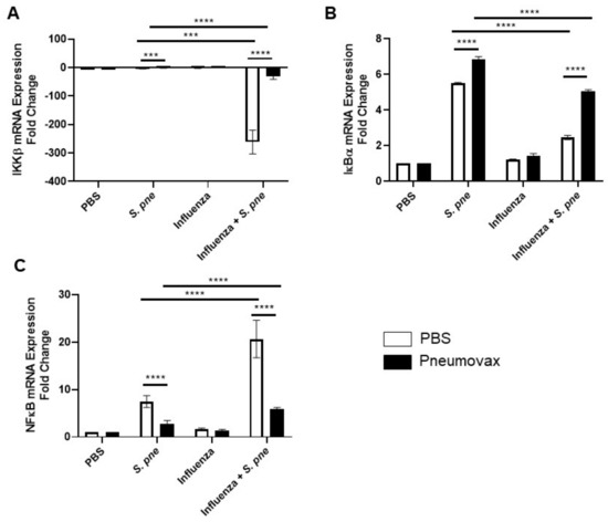 Influenza-mediated changes in NFҡB signaling in aged adult lung contribute to changes in Pneumovax vaccine efficacy. Aged adult (18–20 months) mice received a subcutaneous injection of PBS or Pneumovax (5 mg/mouse) on day 0. On day 14 post vaccination, mice were intranasally instilled with PBS or influenza (A/Puerto Rico/8/1934, H1N1) prior to secondary intranasal instillation with S. pneumoniae (1 × 103 CFU) on day 7 post influenza. (A) IKKβ, (B) IҡBα, and (C) NFҡB mRNA expression was assessed in lung tissue collected from unvaccinated and Pneumovax-treated mice at 24 h post S. pneumoniae. Unvaccinated and Pneumovax mice receiving only PBS or influenza alone were used as controls. Student’s t-test: *** p < 0.001 and **** p < 0.0001. Similar results were obtained from at least three independent experiments, with N = 5 per group. Data are expressed as the mean ± SD.