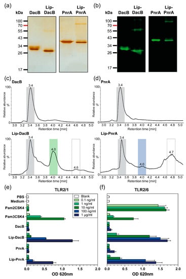 Characterization of lipidated and non-lipidated DacB and PnrA. Purified recombinant lipidated and non-lipidated DacB and PnrA (each 1 µg) were separated by SDS-PAGE (12%) and detected either by silver staining for validation of protein purification (a) or by immunoblots using lipoprotein-specific antibodies (b). Total ion current chromatograms from HPLC of lipidated and non-lipidated DacB (c) and PnrA (d). Separation and elution of the lipidated proteins was enabled by gradually increasing the hydrophobicity with 0.1% formic acid in acetonitrile. The peaks at retention time (RT) 3.4 min and RT 4.0 min reflect non-lipidated and lipidated proteins, respectively. The peak at RT 4.6/4.7 min represents phospholipids from the cell membrane. HEK-Blue-hTLR2-TLR1 (e) and HEK-Blue-hTLR2-TLR6 (f) cells were stimulated with increasing doses of Pam2CSK4, Pam3CSK4, lipidated, and non-lipidated proteins DacB or PnrA. Following stimulation in HEK-Blue detection medium over 15 h, the OD at 620 nm was measured. Mean results of three independent experiments are shown with error bars corresponding to SD. Equally stimulated HEK-Blue-hTLR2-KO-TLR1/6 cells showed signals corresponding to the negative controls (Figure S4).