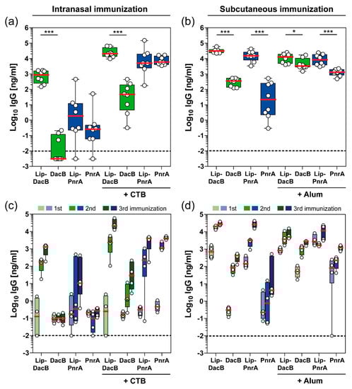 Impact of antigen lipidation on the systemic antibody response in mice. C57BL/6 mice (n = 8/group) received three intranasal (a,c) or subcutaneous (b,d) vaccinations with 5 µg lipidated or non-lipidated DacB or PnrA with or without additional adjuvant. Before each immunization and two weeks after the third immunization, sera were collected and monitored for their antigen-specific IgG concentrations using ELISA. Antigen-specific IgG levels (Log10 ng/mL) in post-immune sera of all mice two weeks after the final immunization (a,b) and kinetics of IgG levels (Log10 ng/mL) following each vaccination of four randomly selected mice per group (c,d) are shown. Box plots represent group median (horizontal red line), first and third quartiles (box), and the range of data (whiskers). Symbols represent individual mice. The dashed line indicates the lower limit of detection. Statistical significance was determined using a Mann–Whitney U test. *, p < 0.05; ***, p < 0.001.