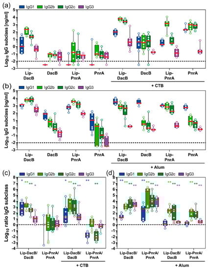 To elucidate the lipidation-induced T helper (Th) cell responses, IgG subclasses (IgG1, IgG2b, IgG2c, IgG3) were measured in post-immune mouse sera (Figure 3a,b), while ratios of IgG subclass concentrations of lipidated to non-lipidated (Lip:NonLip) DacB or PnrA were calculated to focus on the lipidation-induced effects (Figure 3c,d).
