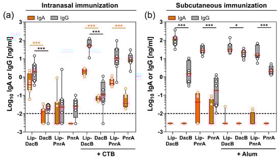 Although substantially lower IgG concentrations were measured in the nasal tissue, mucosal levels showed a consistent pattern compared to the systemic levels. Significant mucosal IgA levels could only be detected following intranasal immunization, whereas subcutaneous immunization did not induce a detectable IgA response. Following intranasal immunization, lipidation significantly increased local IgA levels, with the exception of Lip-PnrA (Figure 4a). Interestingly, lipidation of PnrA enhanced the IgA response when formulated with CTB, while local IgG levels were not affected. These data show that protein lipidation is able to potentiate the systemic as well as the mucosal humoral immune response.