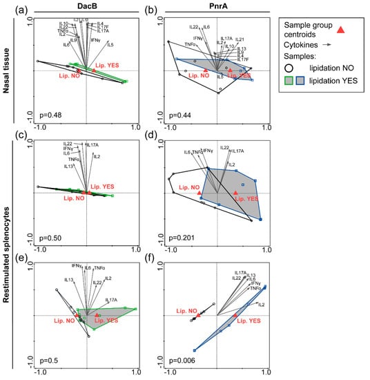 Subsequently, nasal cytokine levels were used for supervised RDA to explore whether certain cytokines correlated with either protein lipidation or adjuvantation (Figure 5a,b; Figure S10a,b). Significant differences in cytokine profiles were observed between groups with and without CTB adjuvant, with nasal IL-17A being the main driver for both proteins, i.e., DacB and PnrA (Figure S10a,b). However, the RDA revealed no lipidation-associated cytokine profile when comparing the lipidated and non-lipidated proteins (Figure 5a,b).