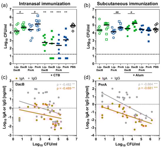 Increased mucosal antibody responses were detected in the nasal tissue that were significantly impacted by lipidation (Figure 4). Following intranasal immunization, elevated levels of nasopharyngeal IgA and IgG correlated inversely with the nasal bacterial load (Figure 6c,d), which was not the case for the subcutaneous immunization (Figure S12). However, serum-derived IgG may have had a significant impact on colonization, since it can reach the surface by paracellular diffusion through the epithelium [30]. Based on correlations of systemic IgG subclass levels and nasal bacterial loads, subclasses IgG2b and IgG2c in particular might have contributed to the reduction in the bacterial loads (Figure S13). Of note, correlations of antibody levels reached higher significance for PnrA-immunized compared to DacB-immunized mice. In addition, nasopharyngeal IL-17A levels that were increased in the CTB-adjuvanted groups following intranasal immunization inversely correlated with protection (Figure S14b,c).