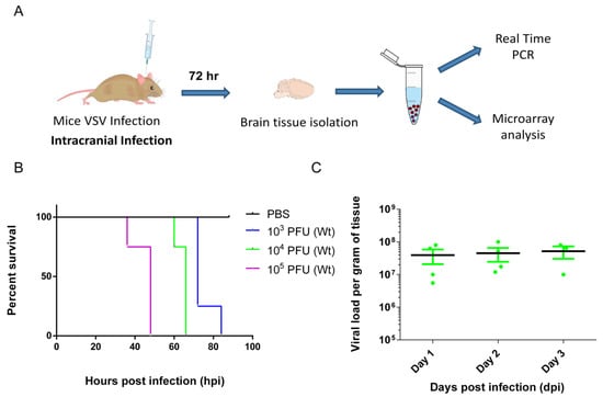 Figure 1. Vesicular stomatitis virus (VSV) infection in the central nervous system (CNS) induces fatal encephalitis in wild type mice. (A) B6 mice (n = 4 per group) were injected intracerebrally with the designated doses of VSV to induce encephalitis. Intracardially perfused mouse brain was collected after 72 hpi to estimate brain viral load and to collect total cellular RNA. Total cellular RNA was later used for gene microarray analysis as well as for validation of real-time PCR assays. (B) Kaplan–Meier survival curve of animals challenged with the varying doses of VSV (doses represented in plaque-forming units (PFU) of VSV are shown in the panel to the right of the graph). (C) In this experiment, all animals were intracerebrally injected with 104 PFU of VSV, and brain viral loads were determined by plaque assay technique conducted in Vero cells at said time points and reported as PFU of VSV per gram of tissue.