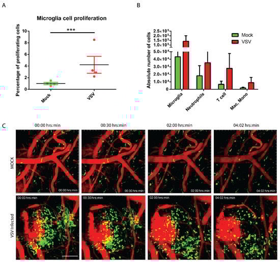 Figure 2. VSV infection in CNS induces microglia proliferation and myeloid cell recruitment. Mice were either infected with 104 PFU of VSV or mock-infected. At day two post-infection, the total CNS myeloid cell populations were analyzed by flow cytometry. (A) Representative dot plot showing the percentage increase in the number of microglia (CD45low, Thy1.2, Gr1, and CD11b+) population in VSV-infected mice brain (n = 4 per group). An asterisk denotes statistical significance, *** denotes p value < 0.001. (B) The bar graph represents the absolute count of myeloid cells obtained from mice brain (n = 4): microglia, neutrophils (CD45low, Thy.12, CD11b+ Gr1+, and Ly6Cmed), monocytes, and macrophages (CD45low, Thy.12, Gr1, CD11b+, and Ly6Chigh) in the CNS of mice (n = 4 per group) following VSV infection. Note an increase in the CNS myeloid cell number in VSV-infected animals compared to the mock-infected animals (p > 0.05). (C) The two-photon light scanning microscopy (TPLSM) was performed through a surgically thinned skull window in mock-infected LysM-GFP reporter mice (upper row) and compared to VSV-infected mice at day three post-infection (lower row). Representative figure showing an increase in the number of cells infiltrated in the brain parenchyma (see corresponding movies Videos S1 and S2). Blood vessels are represented in red, and macrophages, monocyte, and neutrophils are represented in green. Please note the presence of prominent vascular leakage (damaged blood vessels in red) in the VSV-infected brain. Surrounding this, a cluster of infiltrating cells are observed at the beginning of the movie; these cells later shifted to elsewhere over a time period of 4 h.