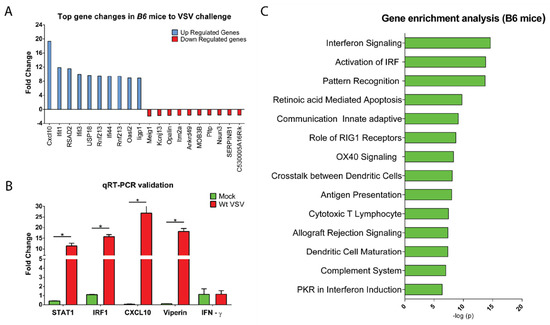 Figure 3. VSV infection in the brain induces IFN-I-driven antiviral response. Microarray analysis was performed on the total RNA extracted from the mice brain (n = 4) tissue at day three post-infection and compared to the mock-infected mice. (A) A representative bar graph showing the top 10 differentially expressed gene candidates (blue represent upregulation while red represent downregulation). (B) Few selected genes falling to the category of antiviral response (STAT1, IRF-1, CXCL10, IFN-γ, and Viperin) were validated by RT-PCR experiments. The fold change in gene expression was calculated by normalizing the data with the housekeeping gene (β-actin) as an internal control from the same sample using ∆∆Ct method. * denotes p-value < 0.05. (C) Ingenuity pathway analysis tool was used to predict the top biological canonical pathways corresponding to the gene expression profile and are represented here in the bar graph. The negative log p values are plotted on the graph X-axis.