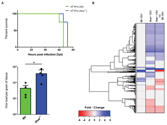Figure 4. VSV infection induces a massive change in the gene expression in the absence of type I interferon. Ifnar−/− mice (n = 4 per group) were intracerebrally infected with the VSV to induce encephalitis, and comparative CNS gene microarray analysis was performed along with the wild type mice. (A) The upper subset represents a Kaplan–Meier survival curve of animals, which shows a marginal delay in onset death in Ifnar−/− mice. While the lower subset represents the brain viral titers determined by plaque assay, which shows a significant increase (p < 0.05) in brain viral load in Ifnar−/− mice. * denotes p-value < 0.05 (B) Global heat map depicting the change in gene expression patterns and clustered based on functional relatedness (see corresponding Table S1). The change in expression level is depicted by blue (upregulation pattern), red (downregulation pattern), and gray (no change in the pattern).