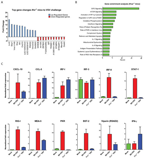 Figure 5. VSV infection in the brain induces type I IFN signaling-independent innate immune pathways. Microarray analysis was performed on the total RNA extracted from the mice brains at day three post-infection along with mock-infected control. (A) A representative bar graph showing the top 10 candidates differentially (upregulated in blue and downregulated gene in red). (B) Ingenuity pathway analysis tool was used to find the top biological pathway in the VSV-infected mice brains and are represented in the bar graph. The negative log p values are plotted on the graph X-axis. (C) A few selected genes were subjected to qRT-PCR analysis to validate the temporal change in the expression observed in microarray analysis, e.g., CXCL10, CCL-5 IRFs, BST-2, Viperin, etc. The fold change in these genes was calculated by normalizing the data with housekeeping gene (β-actin) as an internal control from the same sample using ∆∆Ct method.