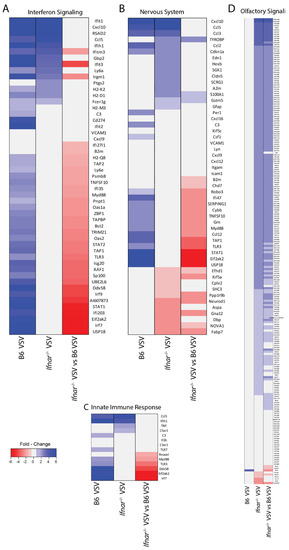 Figure 6. Massive gene expression in the absence of IFN-I signaling during VSV infection. Representative heat maps are shown to differentially regulate genes (p < 0.05, fold expression >1.5) in the absence of the IFN-I signaling associated with the (A) IFN signaling, (B), nervous system, (C), innate immune response, and (D) olfactory related signaling genes at day two post-infection. The aforementioned function was assigned to a gene using the Ingenuity Pathway Analysis (IPA) analysis tool. Blue nodes = upregulated genes, red nodes = downregulated genes, gray nodes = no change.