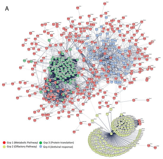 To identify the critical host proteins and pathways involved in the IFN-I-independent activation of the ISGs, network analysis, and Kyoto Encyclopedia of Genes and Genomes (KEGG) pathway analysis were performed by using the Search Tool for the Retrieval of Interacting Genes/Proteins (STRING) 10.5 online database (https://string-db.org/). A protein–protein interaction network diagram was constructed for differentially regulated genes associated with Ifnar−/− infected mice (Figure 7A). When the network was subjected to gene clustering analysis (K clustering), four distinct groups emerged. Further, the KEGG enrichment analysis was performed to assign a functional basis to these groups. This analysis revealed that group-1 genes were associated with metabolic pathways, group-2 with olfactory function pathways, group-3 with protein translation, and group-4 with antiviral immune response functions. The vast majority of upregulated genes were mostly involved in olfactory functions, followed by ribosomal signaling pathways (Table 1).